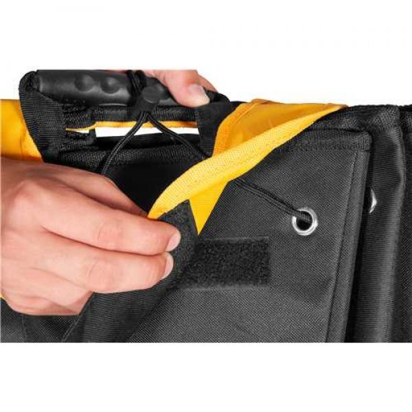 Prática de usar, pois pode ser aberta e fechada rapidamente. Possui alça para transporte e dois suportes para armazenar ferramentas, além de também ser usada para proteção da área de trabalho.