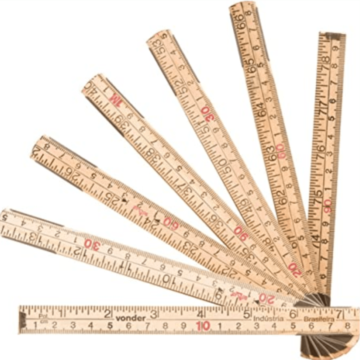 Escala Métrica de Madeira é usada para medições e traçados em geral. Material de madeira oferece maior durabilidade e resistência. Dobrável, proporcionando assim maior praticidade no manuseio e armazenamento.