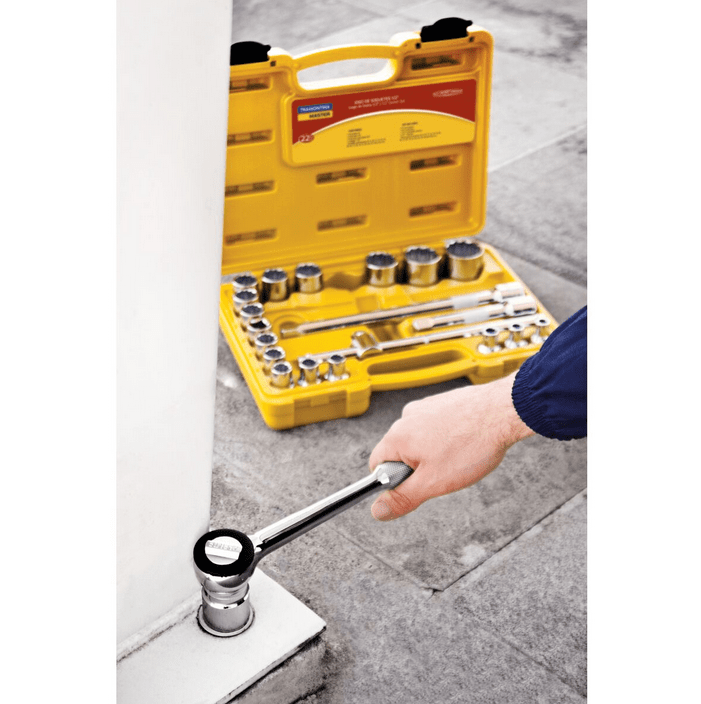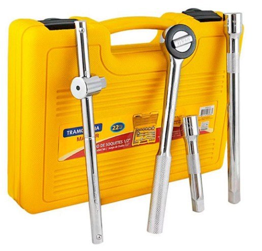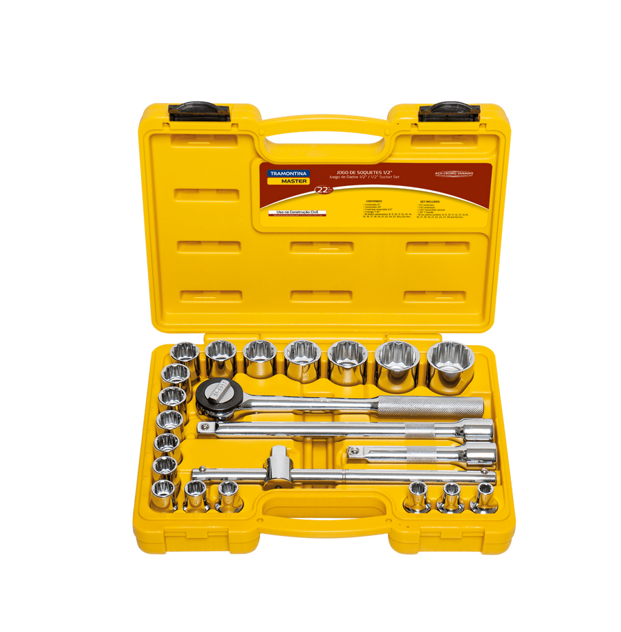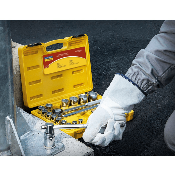 O Jogo de Soquetes Estriados Encaixe 1/2 polegada Tramontina em Aço Cromo Vanádio com Acabamento Cromado e Maleta 22 Peças é um kit completo para você ter sempre à mão.