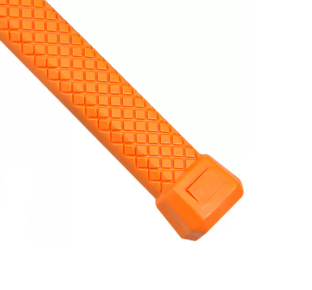 - Cabeça e corpo cobertos por poliuretano na cor laranja.