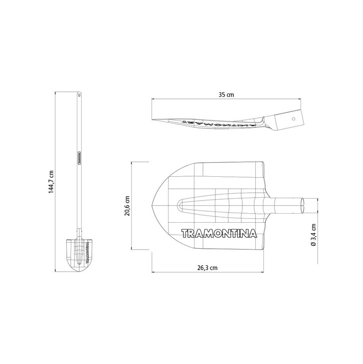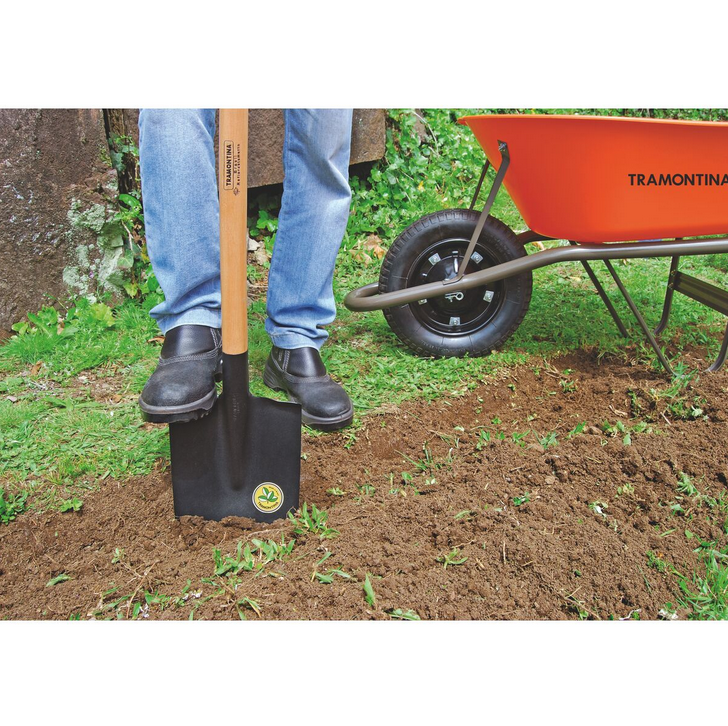 Com cabo de 120 centímetros em madeira envernizada, ela possui ainda virola para apoiar o pé e forçar a entrada da Pá no solo.