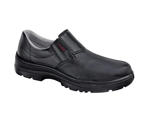 Sapato de segurança em couro relax na cor preta, indicado para prestadores de serviços, áreas de produção, serviços gerais e letristas. Este calçado tem colarinho soft acolchoado na cor preta, fechamento em elástico nas laterais, biqueira de polipropileno, solado isolante em PU bidensidade, injetado diretamente no cabedal, palmilha higiênica com proteção antibacteriana, e palmilha de montagem em poliéster resinado.